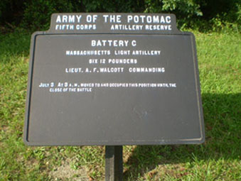 (marker to Lieutenant Aaron F. Walcott’s Battery C of the Massachusetts Light Artillery on Wright Avenue -- note the time of 3 A.M. on July 3 as to when they were ordered to this position)