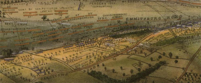 While it is true that the Union Army under General George Meade essentially fought a defensive battle at Gettysburg, he did consider and begin to implement offensive plans to mount an attack on July 2 and also to counterattack on July 3 after Pickett’s Charge, but very little has been written about these aspects of the battle until recent years. It should also be noted that although General Meade did begin to implement the Pipe Creek Circular (see the “The Pipe Creek Circular” section at the beginning of this page) early on July 1 by ordering all the supply trains to Westminster, he soon ordered the other Corps to Gettysburg to support the I and XI Corps already fighting there.