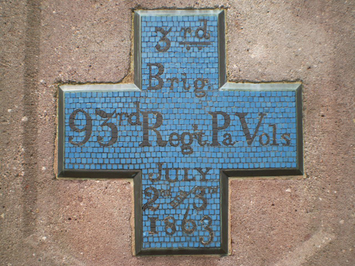 Commanded by Colonel George H. Biddle (and then by Major Edward Pye after Biddle was wounded on July 1), the 95th New York Infantry Regiment (Second Brigade, First Division of the Union I Corps) has its monument on the east side of Reynolds Avenue monument along the south side of the famous “railroad cut”: