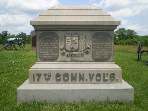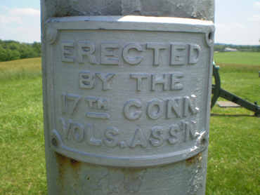 However, the monument to the 17th U.S. Infantry Regiment is located in a small ravine below a stone wall and roughly 40 yards south of the monument to the 11th U.S. Infantry Regiment: