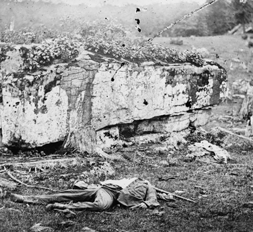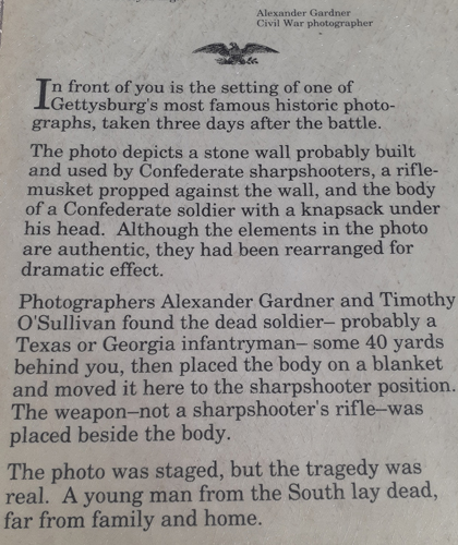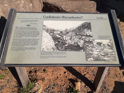 One of most famous (and controversial) photographs of the Gettysburg battlefield is the one taken by Civil War photographer Alexander Gardner supposedly of a dead Confederate "sharpshooter" at Devil's Den. This photograph has long been considered as one that was staged by Alexander Gardner and his team of photographers (Timothy O’Sullivan and James Gibson) shortly after the battle. As initially proposed by eminent Gettysburg resident and historian/photo analyst expert William Frassanito in his 1975 book “Gettysburg: A Journey in Time”, the body is likely one that appears in several other Alexander Gardner photographs taken nearby, then moved to the "sharpshooter" location in the famous photo shown below. An infantry rifle (not a sharpshooter’s rifle) was propped up against the stone wall and a knapsack was propped under the soldier's head to complete the composition.