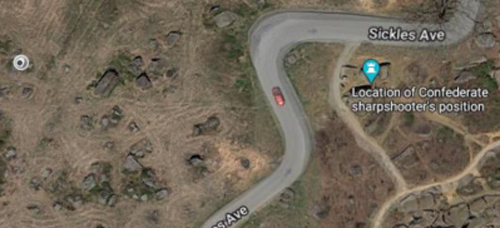 In addition to the famous cavalry action 3 miles east of town on the afternoon of July 3 involving Confederate General J.E.B. Stuart's troops and Union General David M. Gregg's troops that included George Armstrong Custer, there was another charge later that day on the far left of the Union flank in the area of the John Slyder farm. Located on the north (left) side of South Confederate Avenue just before you reach the base of Big Round Top, there is a small parking area on the right side of the road: