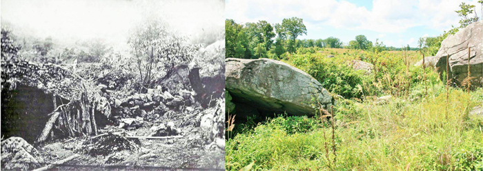 Located nearby roughly 25 yards west of the original location of the famous Devil’s Den “dead sharpshooter” discussed in the section above is what is referred to by historian/photo analyst expert William Frassanito in his evaluation of a photograph by Civil War photographer James Gibson (mentioned in the section above) as “the fortress cave”: