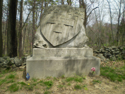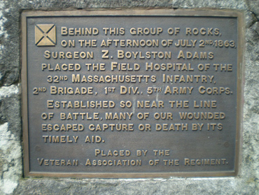 Another overlooked marker is a plaque attached to a boulder located on the north side of Sickles Avenue across the road from the bigger and better known monument (with the likeness of an Irish wolfhound on the front of it) to the Irish Brigade. The plaque marks the location of a temporary field hospital of the 32nd Massachusetts Infantry Regiment that was directly in harms' way during the seesaw battle for the Wheatfield on July 2, and honors their Surgeon, Z. Boylston Adams. The regimental monument, in the shape of a pup tent, is located further up the road on the left.