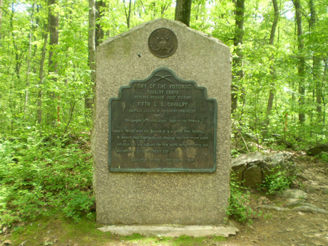 After a moderate climb of about 400 yards, you will reach the monuments to the 5th New York Cavalry Regiment commanded by Major John Hammond, and Battery E of the 4th U.S. Artillery commanded by Lieutenant Samuel S. Elder: