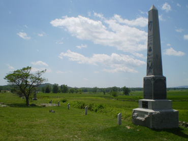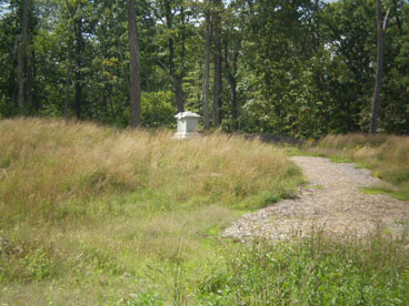 As you continue on South Confederate Avenue across the stone bridge and around the bend, slowly climbing northward along the western base of Big Round Top, you will see a large field off to your left.  Known as the “D-shaped field,” it is the location of the monument to the 1st Vermont Cavalry Regiment and the approximate location where the official accounts reportedly indicate that General Farnsworth was killed. The monument is about 55 yards off the road and is easily accessible by the path visible in the photo on the left below: