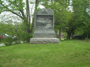 Located roughly 15 yards north of the Lydia Leister house along the Taneytown Road is a small monument to Companies E and I of the 6th Pennsylvania Cavalry Regiment (also known as “Rush’s Lancers”), which were on detached service at General Meade’s headquarters: