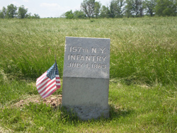 There is an advanced position marker for the 157th New York Infantry Regiment commemorating their participation in the fighting for Oak Hill on July 1, and it is unusual in that it does not contain any inscription to that effect. However, the monument (one of two for the regiment: the one being referred to is the state monument; the other monument erected by the survivors of the regiment is located farther west at the southeast corner of the “T” intersection of Howard Avenue and the Mummasburg Road) which is located north of town at the southwest corner of the intersection of Howard Avenue and the Carlisle Road (Route 34) contains two small plaques indicating that the marker for the advanced position of the regiment is 300 yards farther north (on the west side of the road):