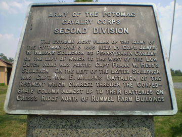 There is also a small cavalry plaque that is nearby on the east side of the East Cavalry Battlefield. Located approximately .8 of a mile north of the Hanover Road (Route 116) on the east side of Low Dutch Road, the marker indicates the approximate location of the far right flank of the Union cavalry held by the 3rd Pennsylvania Cavalry Regiment on July 3: