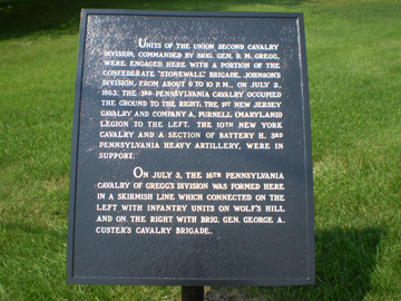 There are two fine monuments on the north side of the Hanover Road approximately 1 mile apart to two of the Union military units which participated in that often overlooked action on July 2, the 10th New York Cavalry Regiment (approximately 1.3 miles east of Benner's Hill) commanded by Major Matthew H. Avery: