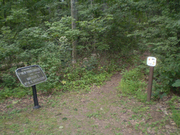 Another overlooked portion of the South Cavalry Battlefield is Bushman Hill, located west of Big Round Top on the south side of South Confederate Avenue. The site where the 5th New York Cavalry Regiment was positioned prior to its participation in General Farnsworth's attack and where Battery E of the 4th U.S. Artillery was placed to help support the attack, the summit of Bushman Hill where the monuments to these to units are located can be reached by way of three different footpaths. The one footpath (see the photo below on the left) begins about 30 yards past the statue of Major William Wells, who took command of the 1st Vermont Cavalry Regiment after General Farnsworth was killed. The other path (see the photo below on the right) begins about 200 yards before the parking area where the interpretive markers are located (see the first two photos at the beginning of this section):