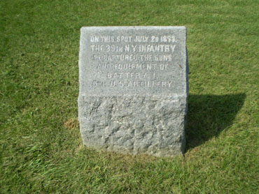 There is an advanced position marker for the 39th New York Infantry Regiment (which only had 4 Companies) that is located roughly .3 of a mile east of the Emmitsburg Road on the north side of United States Avenue and about halfway between the Abraham Trostle farm and the George Weikert farm. Commanded by Major Hugo Hildebrandt, the regiment (also known as the Garibaldi Guard) made a gallant charge against the 21st Mississippi Infantry Regiment in the late afternoon of July 2 and then recovered the 4 cannons of Battery I of the 5th U.S. Artillery commanded by Lieutenant Malbone V. Watson. This small marker is near the monument to Watson’s Battery (see the photo on the left below), but it is my understanding that the actual location where this action occurred is slightly further west on a small knoll on the south side of United States Avenue just east of the Trostle barn:
