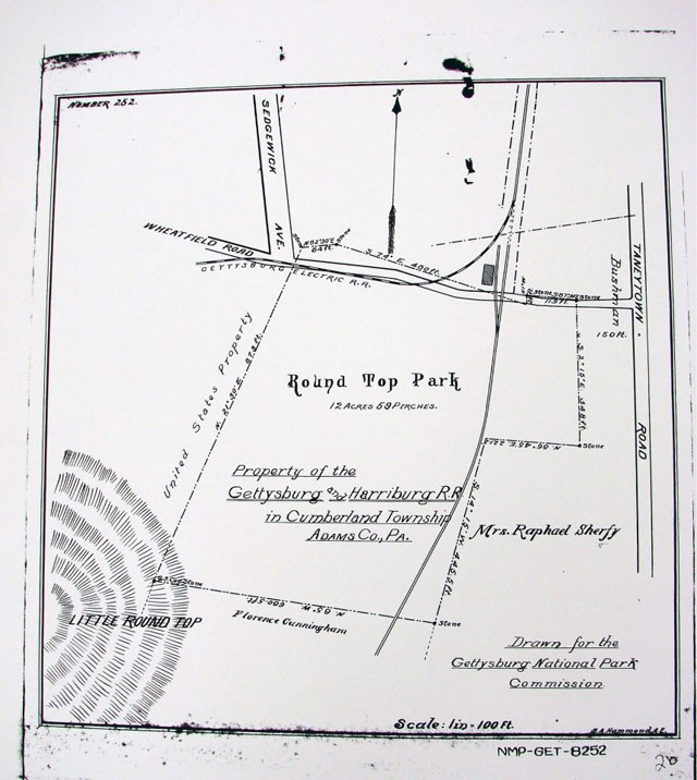 to Round Top Park. Completed in 1884, the railway line came down from the north along Oak Ridge to the depot on the western side of town at Washington Street and Railroad Street, with the spur running southward directly across the fields of Pickett’s Charge and ending at the eastern side of Little Round Top (see the map below):
