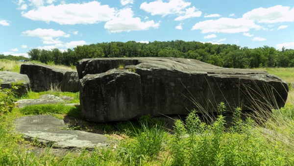 It is located approximately 40 yards off the trolley path by heading north toward the Wheatfield on the west bank of Plum Run, and is easier to spot during the fall.