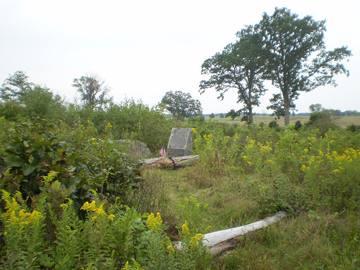 The two-day struggle for control of the William Bliss farmhouse and barn, situated in "no-man's land" between Cemetery Ridge and Seminary Ridge west of the Emmitsburg Road, resulted in the farmstead changing hands between Union and Confederate troops about 10 times. Finally, both structures were intentionally torched by Union troops on July 3 in order to deprive the Confederates of a location for an observation post, advanced skirmish line, and a great position for sharpshooters. Neither buildings were rebuilt after the war, so all the visitor to the battlefield will see are the remnants of the typical earthen ramp leading up to the upper floor of the barn, three small Union markers to the 12th New Jersey Infantry Regiment, the 1st Delaware Infantry Regiment, and the 14th Connecticut Infantry Regiment (see the bottom three photos), and one small marker indicating the former location of the farmhouse. If you look to the west from the Emmitsburg Road, you can see the remnants of the earthen ramp and two of the three regimental markers (see the photograph directly below):