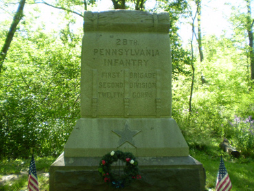 Occasionally, an entire regiment was used to form a skirmish line, as was the case with the 28th Pennsylvania Infantry Regiment on the eastern side of Culp's Hill near Rock Creek for most of July 2. Although the monument is visible along East Confederate Avenue about 75 yards behind the tablet for Confederate General George H. Steuart's Brigade of General Richard S. Ewell's II Corps, many (if not most) visitors assume it is a Confederate monument as well.